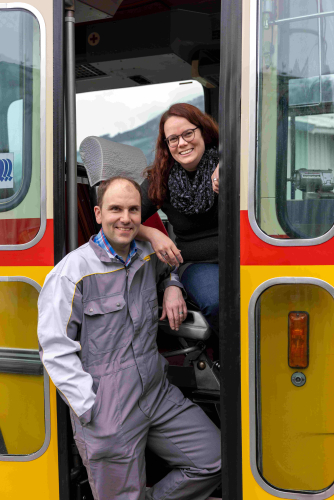 Für diese Geschichte muss man kurz den Rückwärtsgang einlegen und bis zu dem Moment retour fahren, als Eveline Ackermann eine Passfahrt mit dem Postauto über die Grimsel machte. «Am Steuer sass Andreas – und da ich trotz Ferien und Prachtswetter der einzige Fahrgast war, kamen wir sofort ins Gespräch.» Der Rest ist eine perfekte Dreiecks-Liebesgeschichte: «Andreas musste keinerlei Überzeugungsarbeit leisten, um mich auch auf den Postauto-Geschmack zu bringen. Schon bevor wir uns begegnet sind, mochte ich historische Fahrzeuge und arbeitete in meiner Freizeit als Freiwillige bei der Furka-Dampfbahn mit», erinnert sie sich.