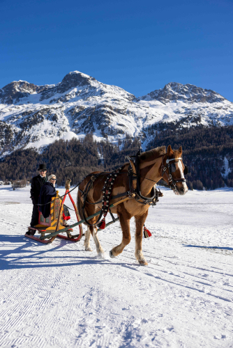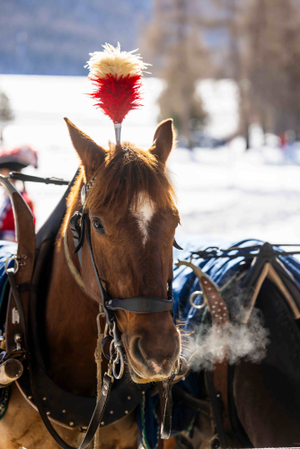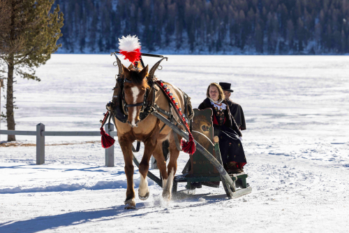 Die Kälte hat den Engadiner Morgen fest im Griff. Festlich aufgez.umte Pferde schnauben leise, ihr Atem gefriert in der trockenen Luft. «Es ist nicht das erste Mal, dass sie bei einer Schlitteda dabei sind. Die Tiere spüren, dass sie und ihre Passagiere bald im Mittelpunkt stehen werden», sagt Marco Murbach. Der Einheimische ist Mitorganisator dieses Brauches, der jeweils an einem Sonntag im Januar oder Februar stattfindet und zu den gesellschaftlichen Höhepunkten des Engadiner Winters zählt.