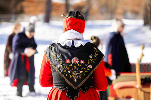 Dann setzt sich die Kolonne in Bewegung. Die prächtigen Pferdegeschirre mit den teilweise gestickten Schellenriemen kündigen den Menschen am Strassenrand an, dass hier etwas Besonderes passiert. Ab und zu steigt ein «Viva la Schlitteda» oder ein Juchzer in die klare Engadiner Luft. «Auf diesen Moment freuen wir uns hier fast wie auf Weihnachten», sagt Murbach. «Bei den Älteren werden Erinnerungen wach an Zeiten, in denen sie und ihre Liebsten selbst auf dem Schlitten sassen.» Denn früher war die Schlittenfahrt jungen Paaren vorbehalten, die ihre Verbindung vielleicht zum ersten Mal der Öffentlichkeit kundtaten. Auch Catti Moder ist ihrem späteren Mann, während einer Schlitteda «nahegekommen», wie sie erzählt.