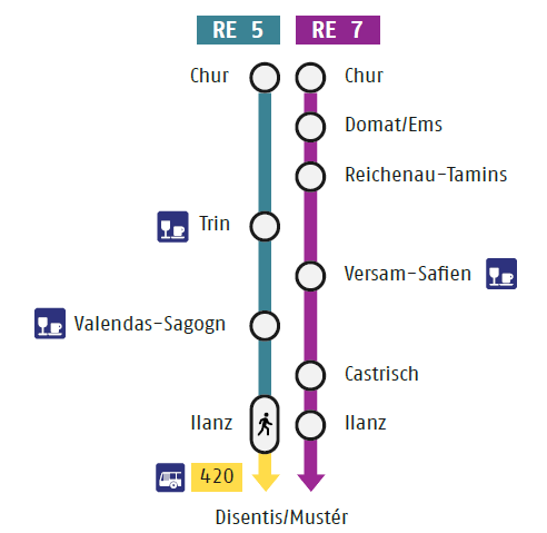 Auf der Strecke Ilanz–Disentis/Mustér–Dieni fahren die Busse der Linie 420 täglich im Stundentakt. In Kombination mit den Zugsverbindungen entstehen zwischen Ilanz und Dieni von 06.00 bis 20.00 Uhr halbstündliche Verbindungen. In Ilanz resultieren draus gute Anschlüsse von/nach Chur.